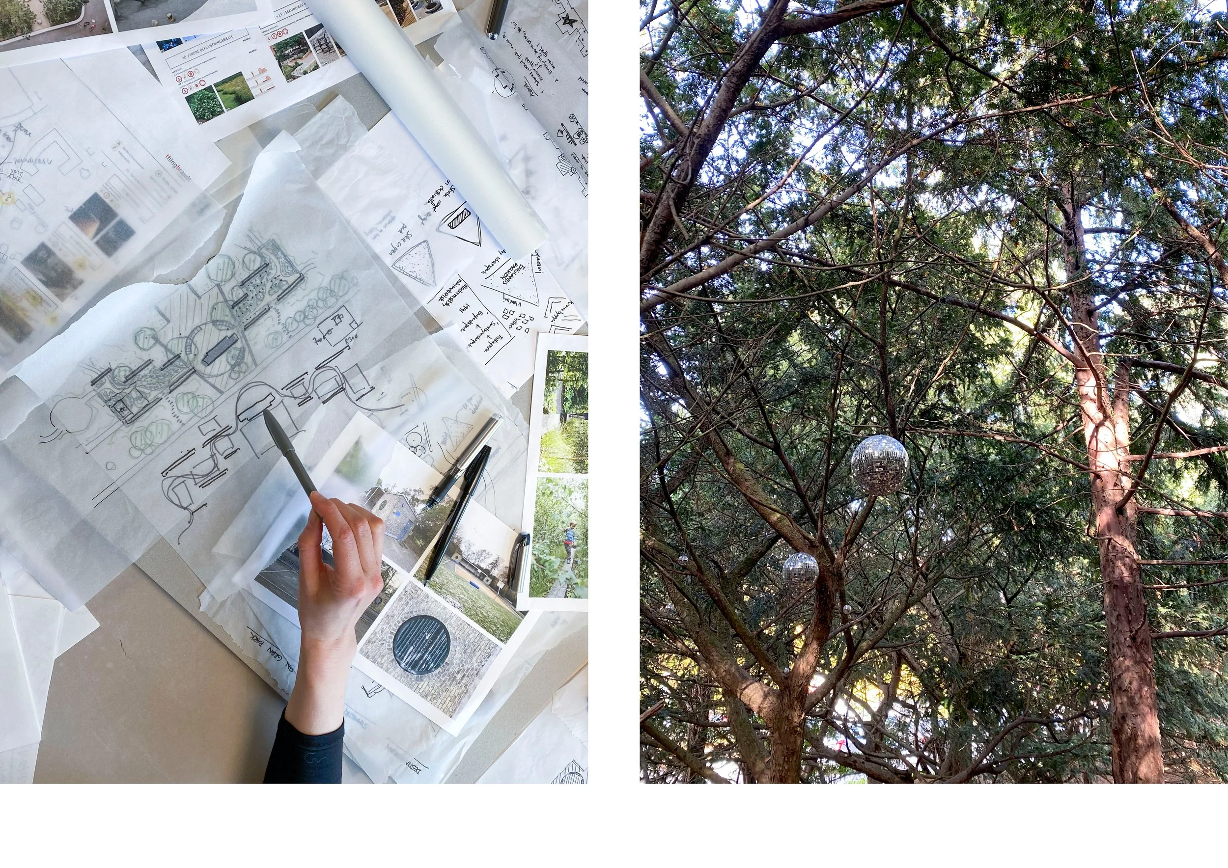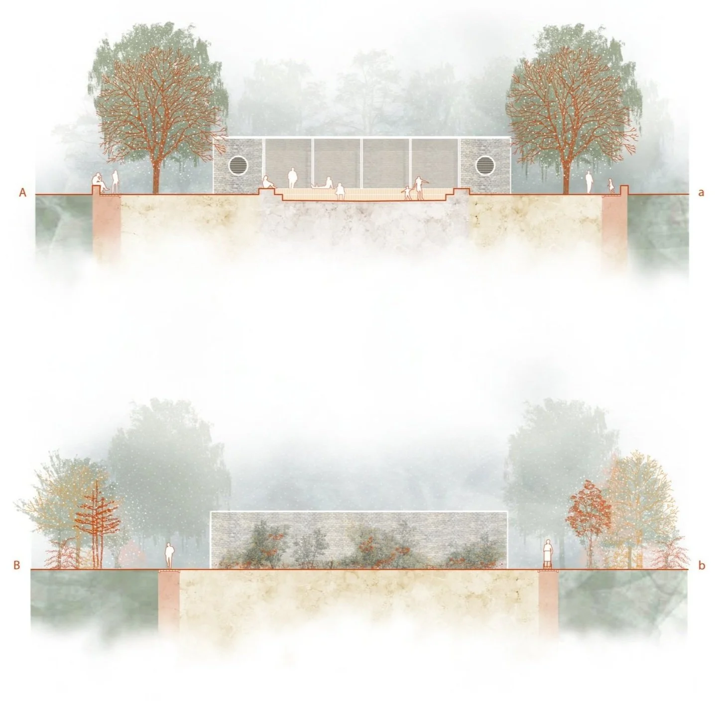 Vi arbejder med enkle, stærke greb med fokus på genbrug af materialer og plads til finurlige detaljer. Ved aktivitetsområdet bliver en nedsænket scene en ny, samlende opholdsplads foran læhuset. Her kan større samlinger, teaterforestillinger, løbehjulsleg eller loppemarkedet finde sted. Læhusets centrale placering rammes ind af et klinkebånd og murskiver der skyder sig op fra befæstelsen. Murskiverne skaber uformelle opholdsmuligheder og rammer det centrale rum ind. På siderne kommer man ud til de finurlige legepladser. I samarbejde med Elverdal har vi skabt en unik, identitetsskabende legeplads, som tager afsæt i lokale børns fantasifulde tegninger. Legeområderne brydes ned af linjer af flerstammede træer, som til sammen danner mindre rummeligheder. De lave, flerstammede træer danner kontrast til de store, eksisterende piletræer som ligger spredt rundt omkring aktivitetsområdet.